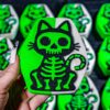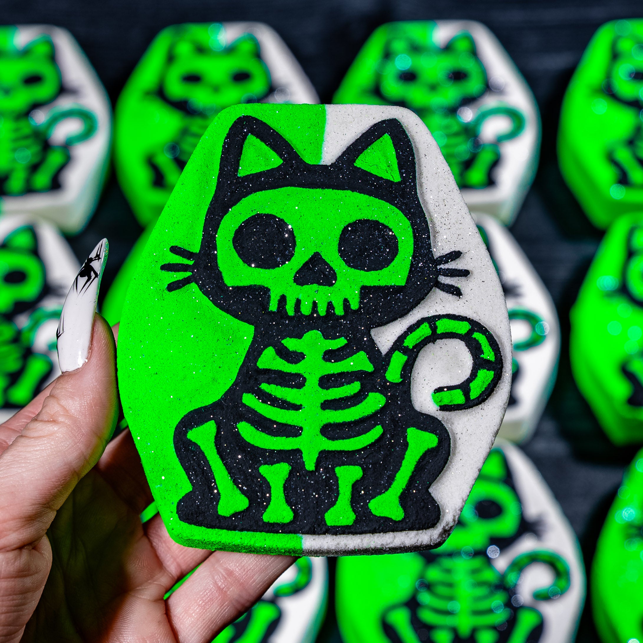 A ghostly green skeleton cat that fizzes with a fruity blend of kiwi, watermelon, and cherry—purrfectly wicked and ready to claw its way into your tub.