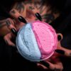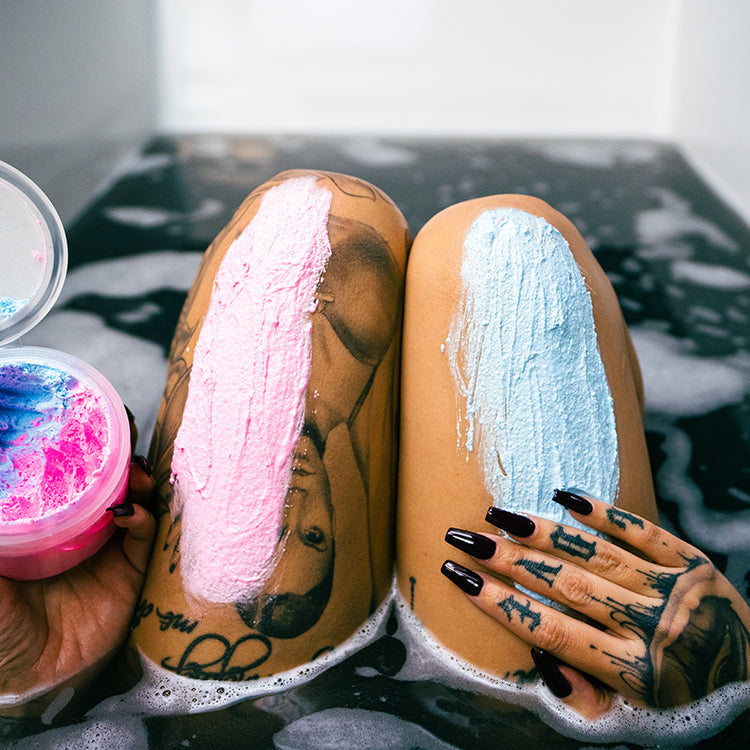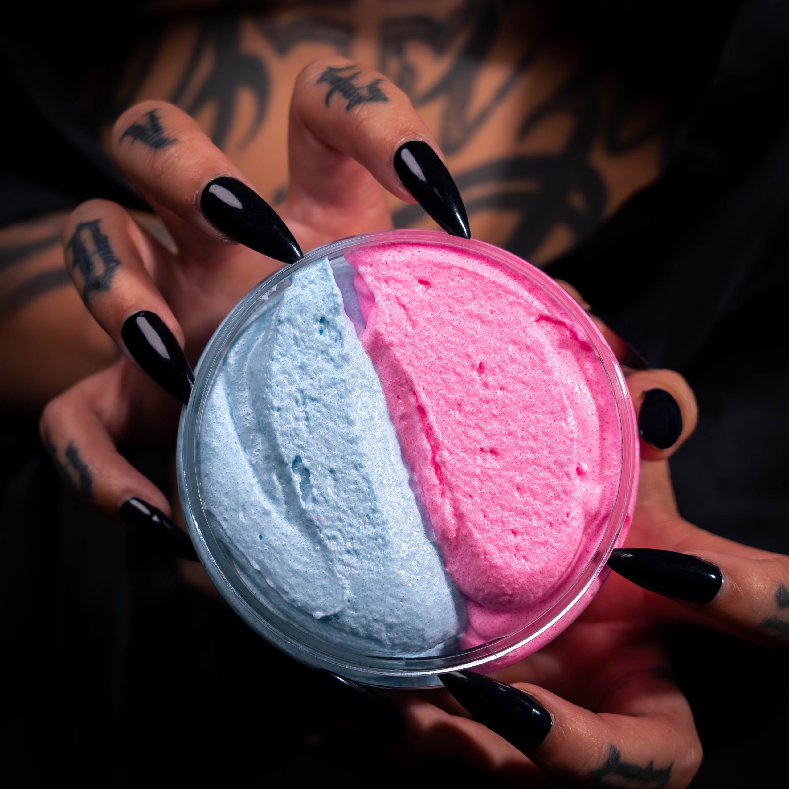 Blue and pink frosting frenzy scented with birthday cake and cotton candy—your skin’s sweetest nightmare.