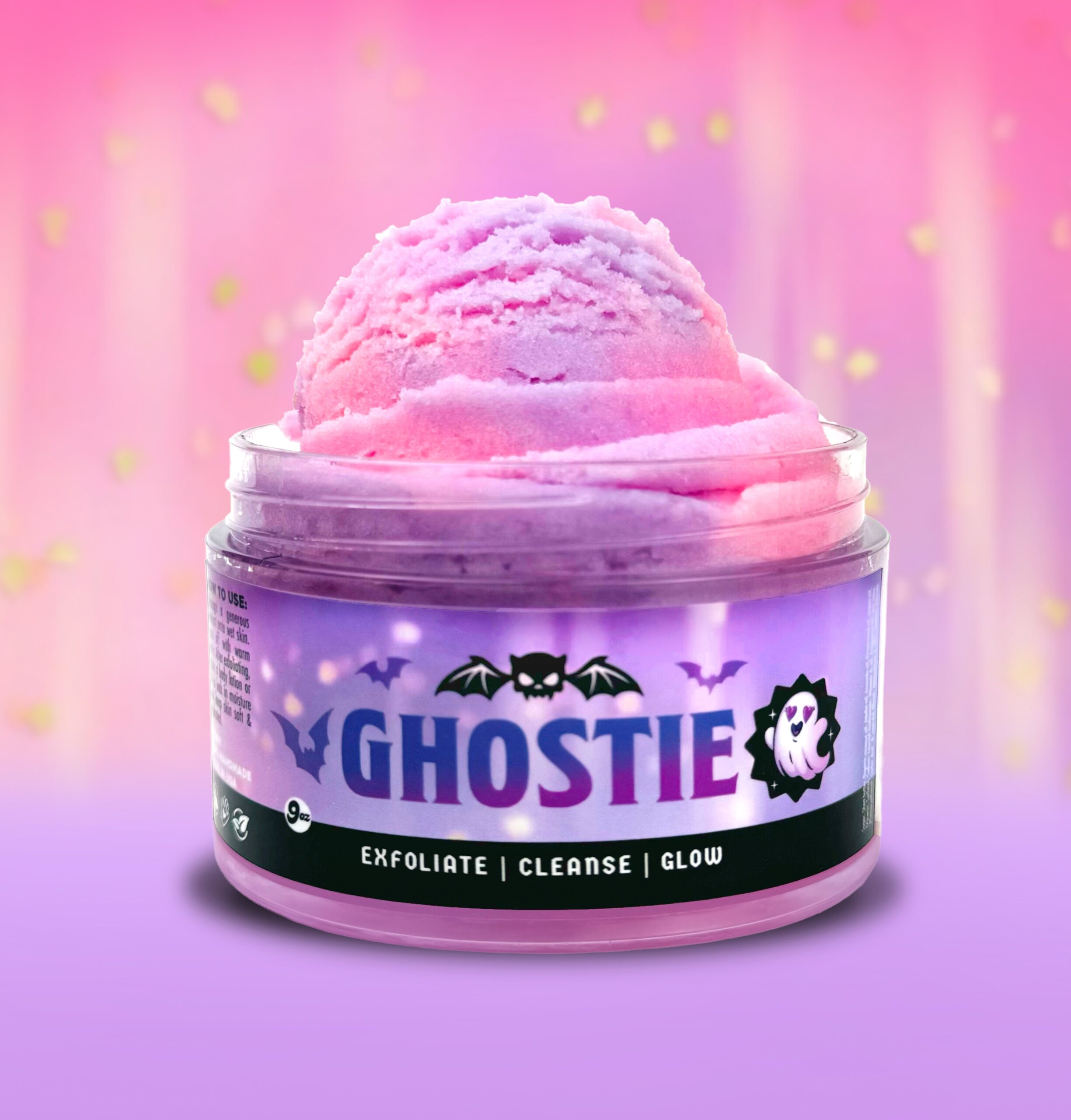 A pink and purple cloud of ghostly exfoliation. Buff, polish, and smell like luxurious marshmallows—fluffy skin, spooky finish.