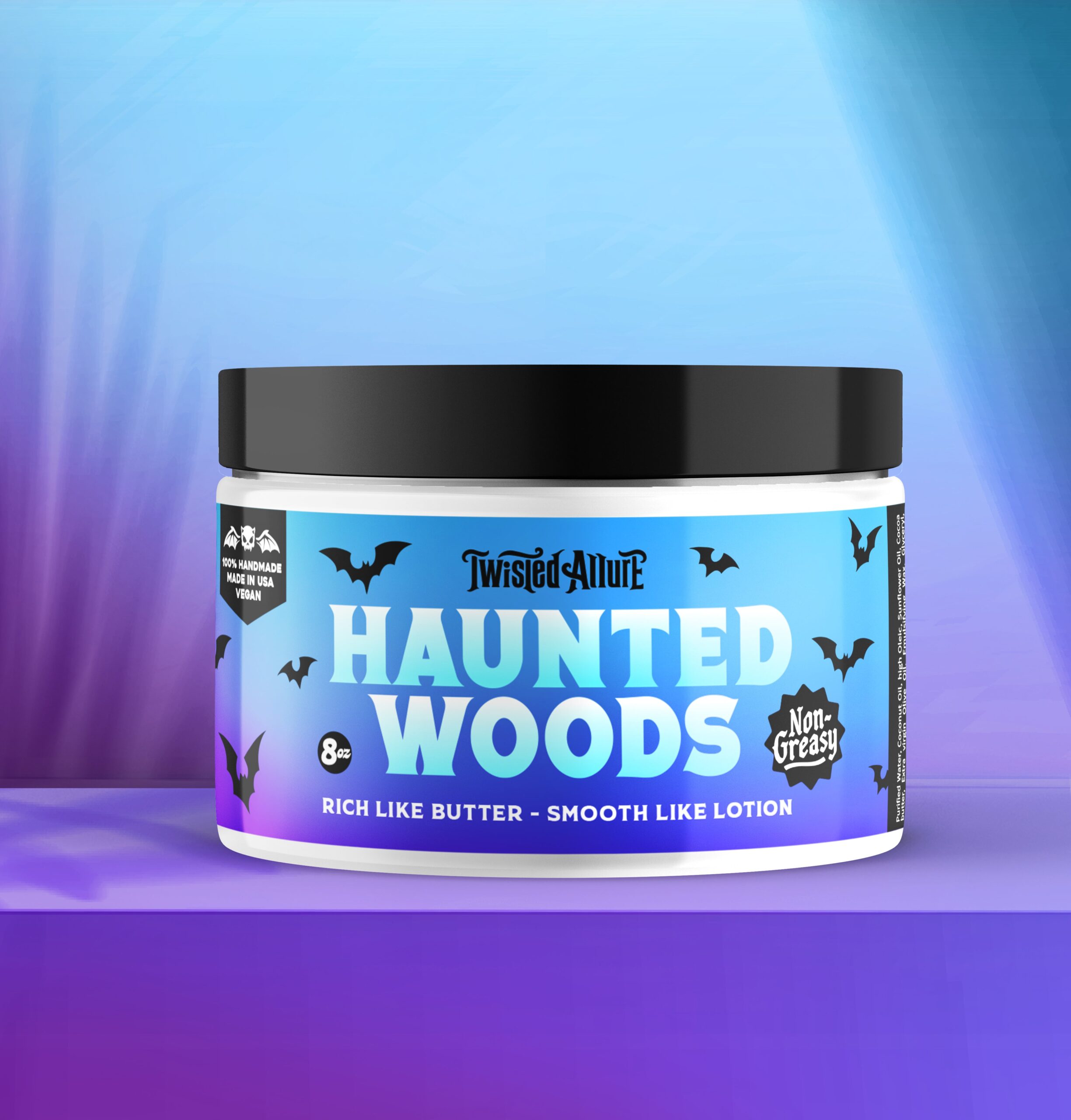 Haunted Woods Body Butter wraps skin in lavender, musk & woods. A hauntingly luxe moisturizer with earthy, soft allure.