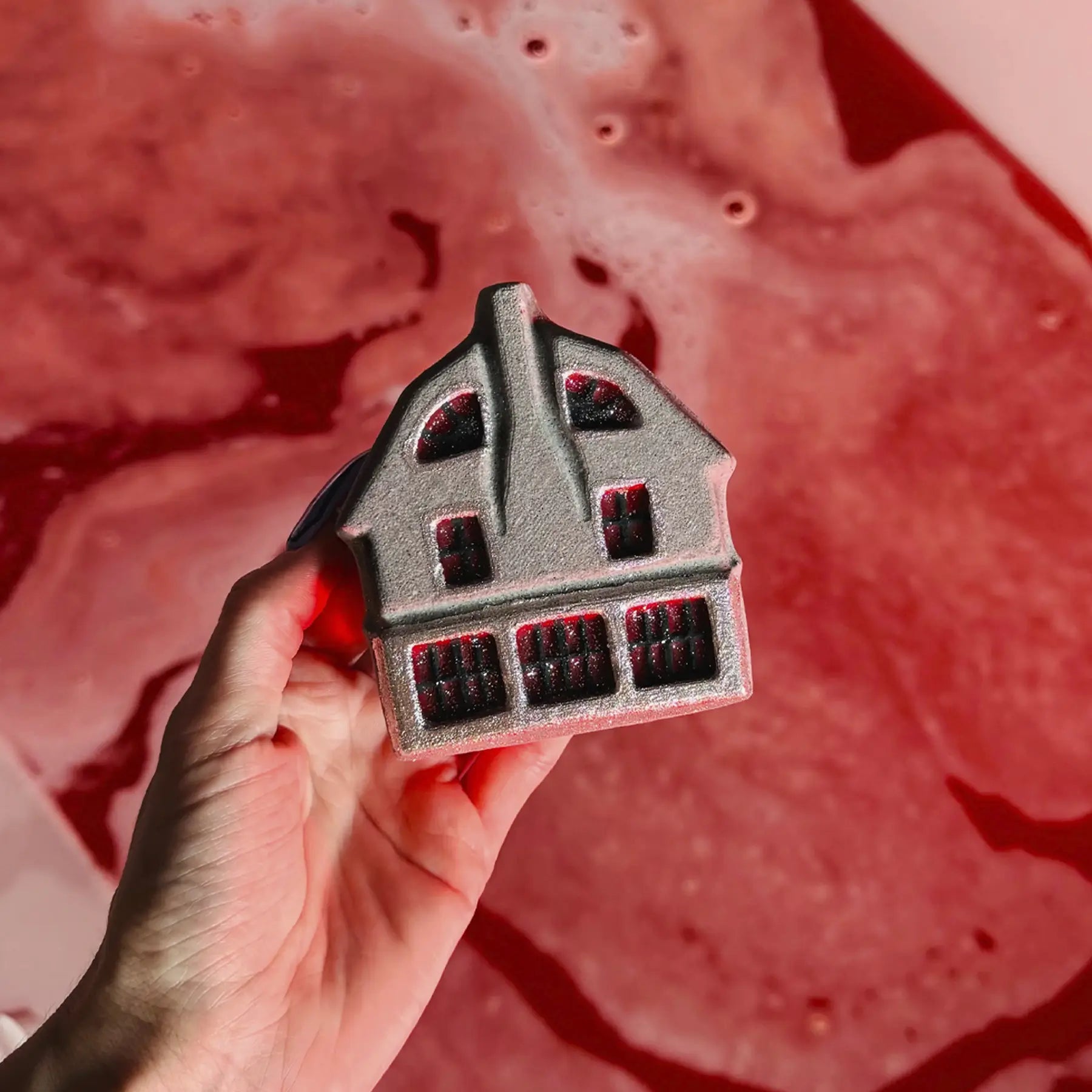 A haunted mansion bath bomb with iron gates and sinister charm—black cherry creeps from every crack for a wickedly juicy escape.