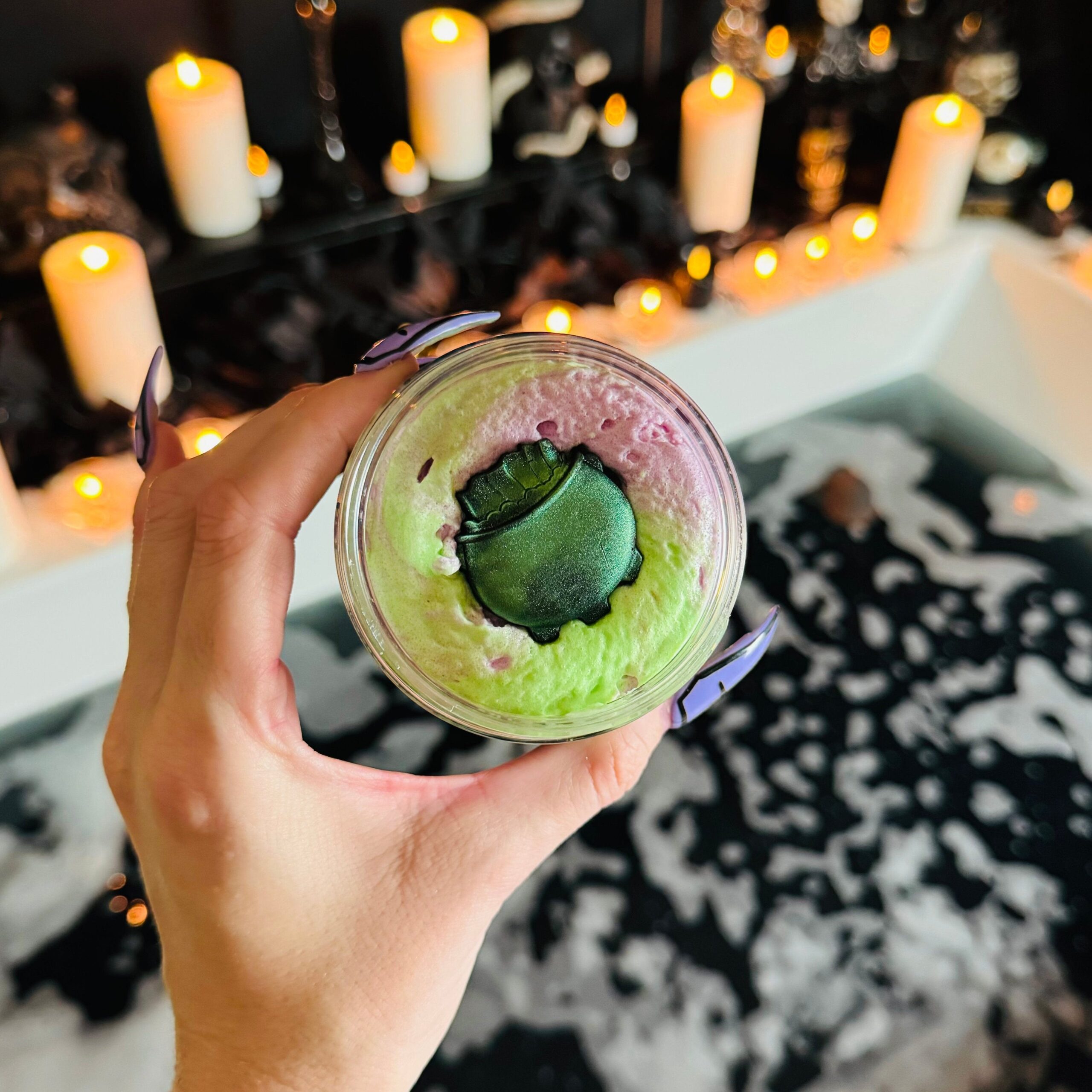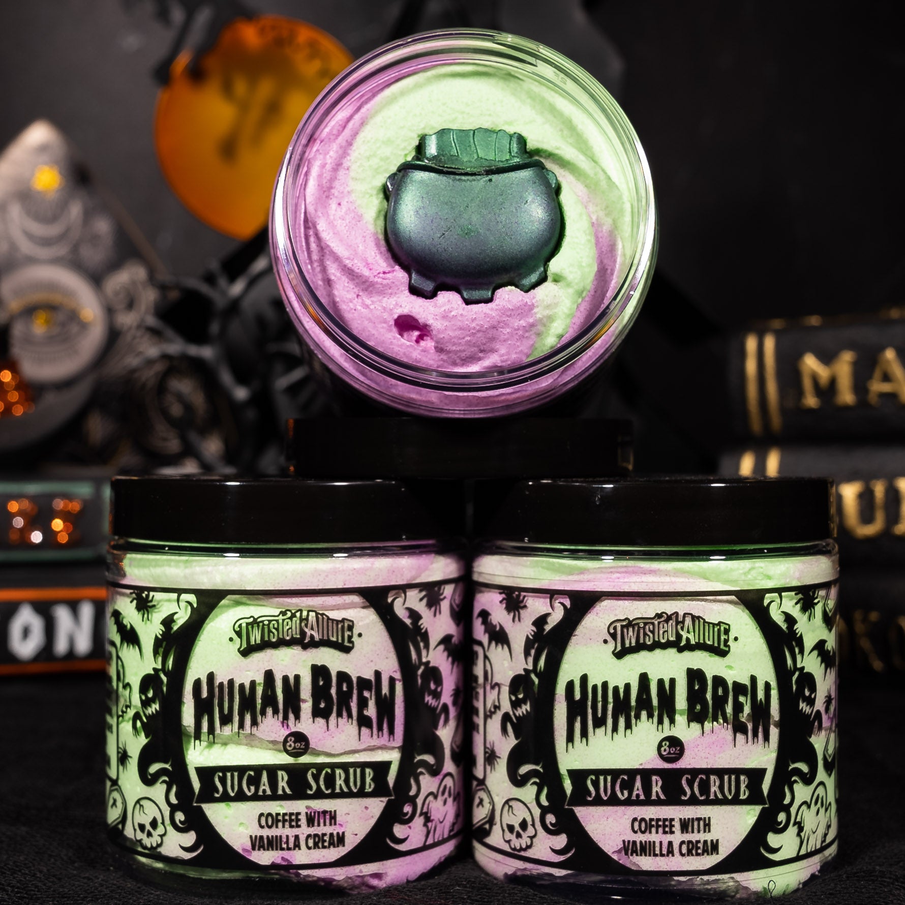 Pale green and purple scrub steeped in coffee and vanilla cream—rich, smooth, and brewed for mortal skin.