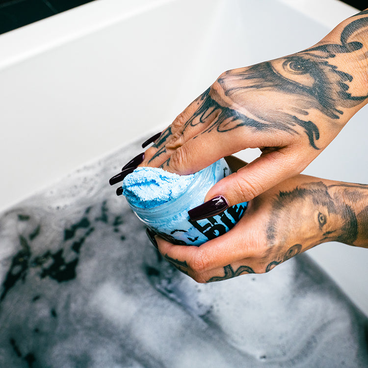 Bold blue scrub with a complex blend of citrus, sandalwood, bergamot, and vanilla—scary smooth, hauntingly irresistible.