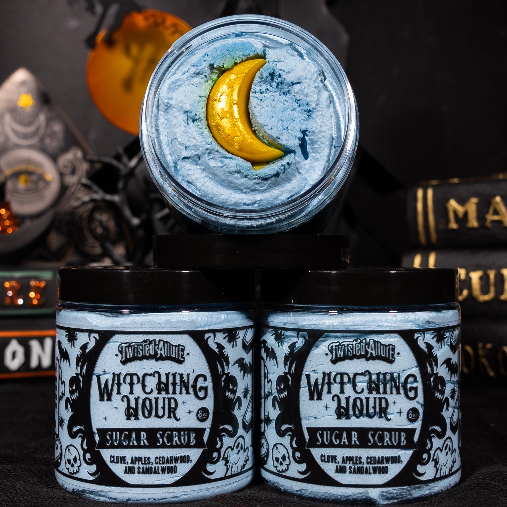 Blue scrub with a golden moon topper and a magical blend of clove, apple, cedarwood, and sandalwood—your midnight ritual in scrub form.